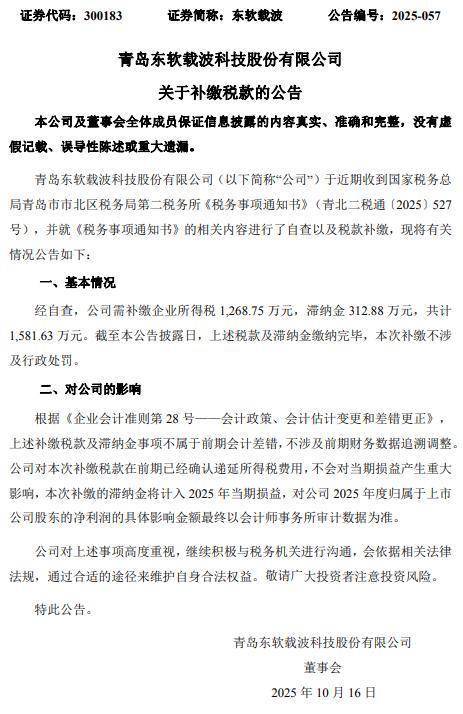10月16日摩根策酪,东软载波(300183)发布公告,近期收到国家税务总局青岛市市北区税务局的《税务事项通知书》,经自查,公司需补缴企业所得税1269万元,滞纳金313万元,共计1582万元。截至公告披露日,上述税款及滞纳金已缴纳完毕,本次补缴不涉及行政处罚。