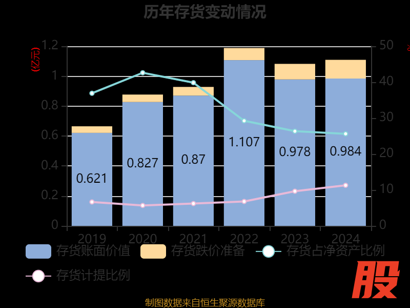 从存货变动来看,截至2024年末,公司存货账面价值为9839.75万元,占净资产的25.62%,较上年末增加64.07万元。其中,存货跌价准备为1252.91万元,计提比例为11.29%。